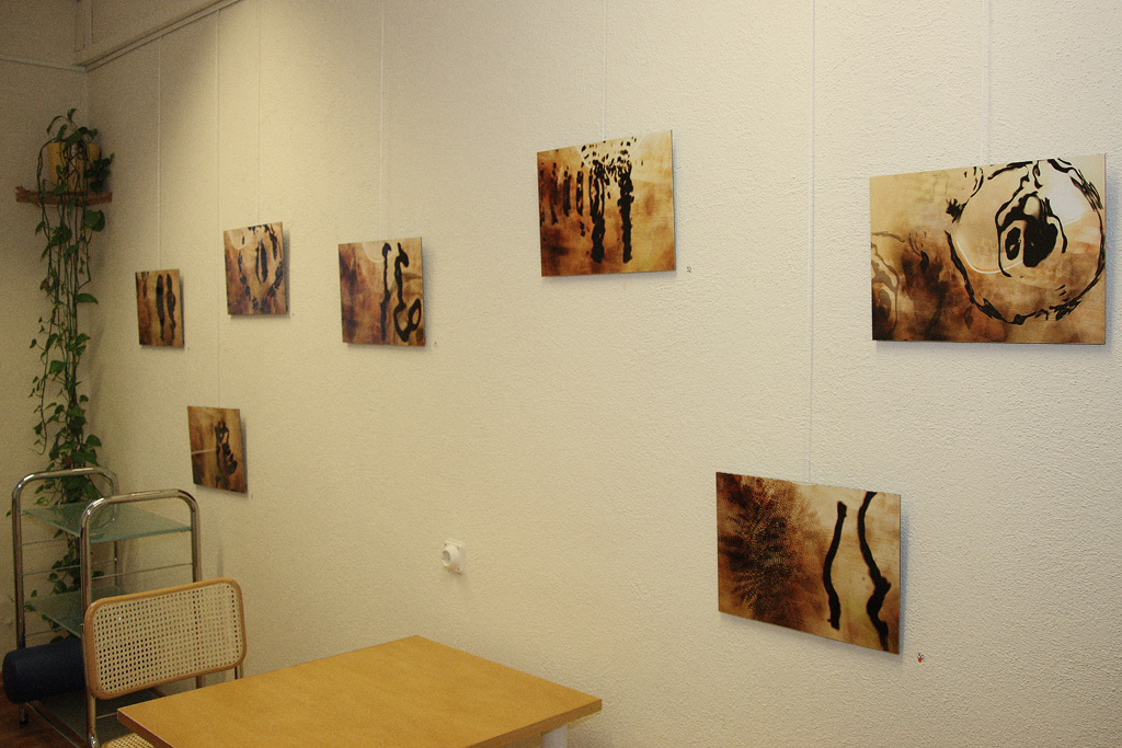 Sind diese Bilder im Kasten - für sich schon ein hartes Stück Arbeit -geht hier die Suche der Künstlerin noch weiter, denn: Jetzt beginnt eine andere Arbeit, nämlich die des Herauskristallisierens von nun im Bild inhärenten Mustern oder Zeichen, die sie aber erst aus der Materie herausholen muss. Dies geschieht durch schrittweise Manipulationen an den Bildern, bis sich bestimmte Formen, die zum Teil auch organisch erscheinen, aus der Bildinformation herauslösen und herausspringen (die Werke "Licht-Klang-Dialog" 1 - III, 2009, von denen zwei im grossen Ausstellungsraum hängen).